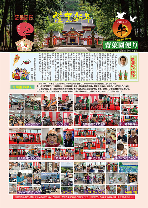 2026/01/04 🌈2026年 「青葉園便り」を発行しました🌈 ※顔を伏せていない利用者様は、ご家族から写真掲載の同意をいただいております。 ※バナーをクリックすると、FacebookとInstagramへ飛びます。